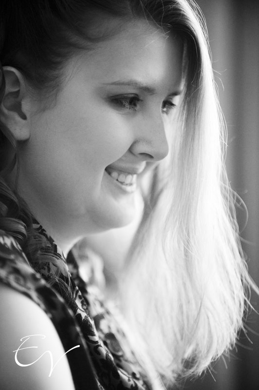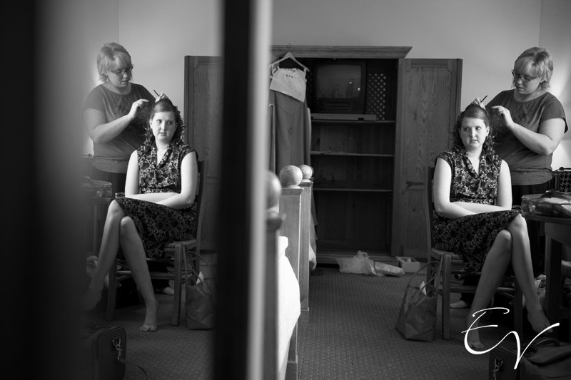 She was calm and cool before the ceremony but couldn’t help cracking a smile while watching her bridesmaids joke around during hair and makeup.